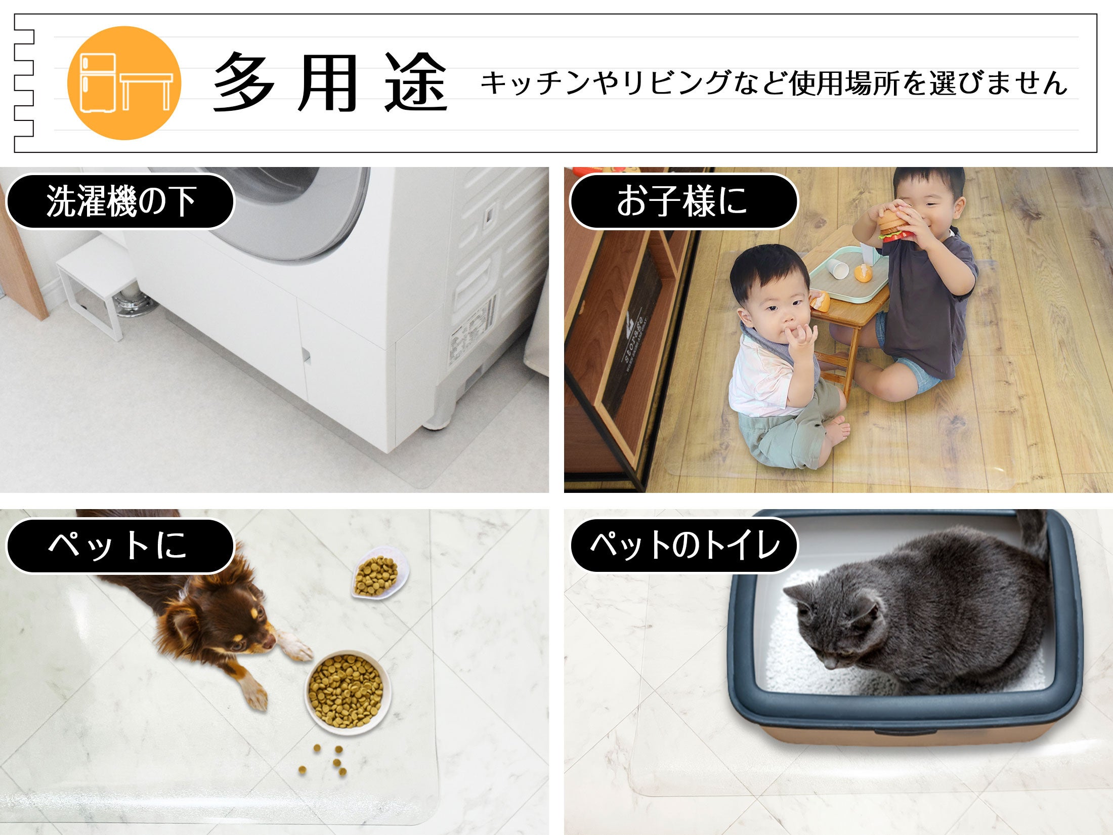 冷蔵庫マットとしての利用はもちろん、洗濯機の下、デスク下のチェアマット、お子様の食べこぼし対策、ペットのトイレ周りなど、撥水・防カビ・滑り止め(裏面エンボス加工)を活かした幅広い用途でご活用いただけます。