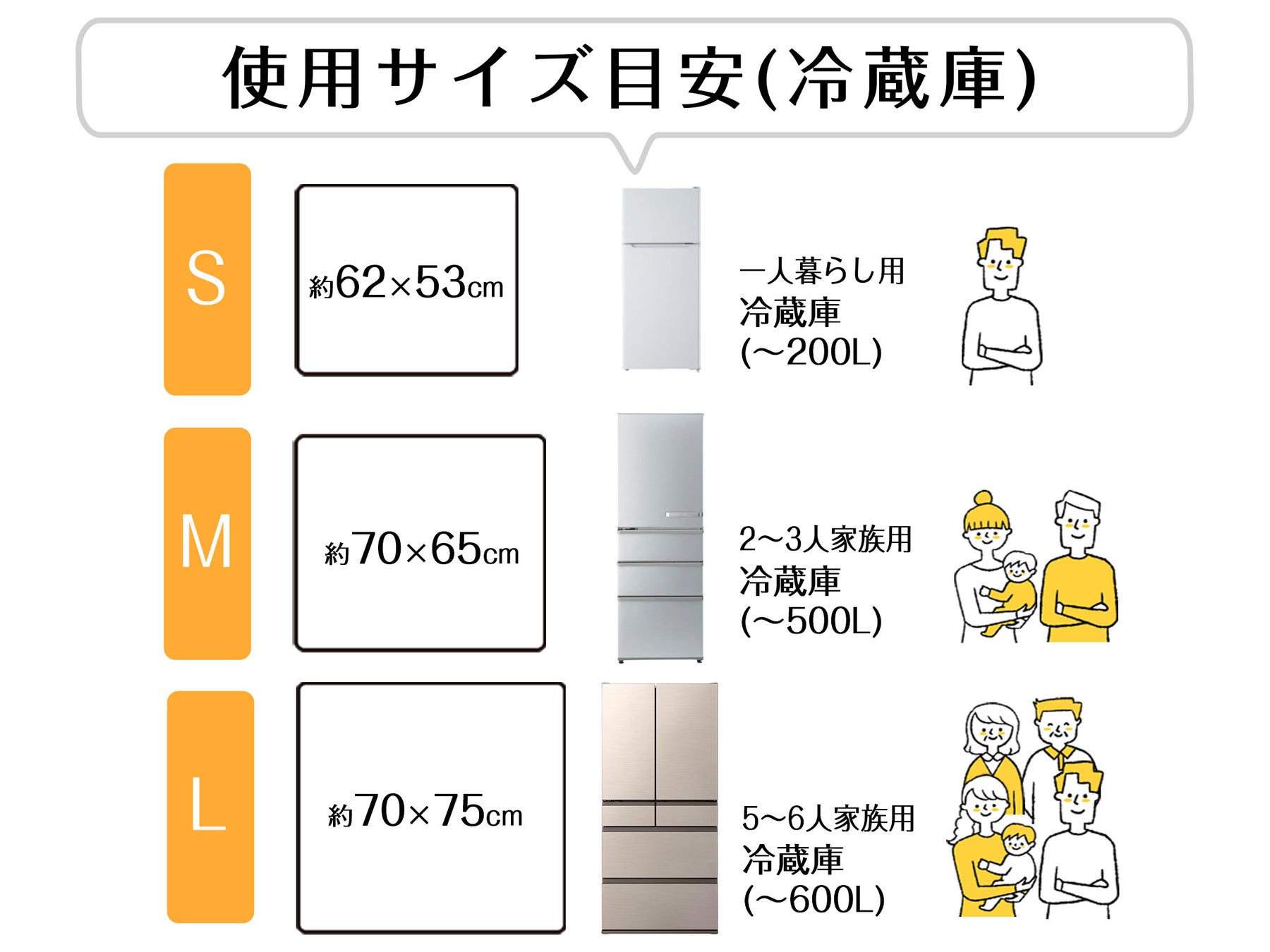 冷蔵庫の容量に合わせた3サイズ(S/M/L)に加え、2mm厚と、より衝撃に強い3mm厚の2タイプをご用意しています。