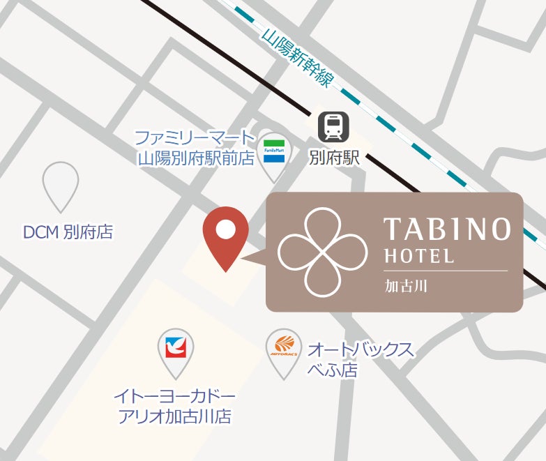 このたび、「たびのホテル」の第9号店として開業する「たびのホテル加古川」は、山陽電鉄本線・特急停車駅「別府(べふ)駅」から徒歩1分の便利な立地にあります。大阪梅田駅から乗り換えなしで訪れることができ、姫路駅(国宝・姫路城)からも電車で約30分という利便性の高いロケーションです。ホテル後方には地域最大級の「イトーヨーカドー加古川店」があり、生活雑貨、飲食店などが揃っているため、長期滞在にも非常に便利です。加えて、80台収容の自走式駐車場も完備しており、お車でのご来館にも対応しています。近隣には、聖徳太子にゆかりの地である鶴林寺(かくりんじ)や国指定史跡の西条古墳群、広大な敷地を持つ日岡山公園など、観光スポットも充実しており、歴史と自然を堪能する観光拠点としてもご活用いただけます。
