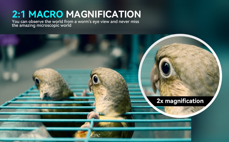 極限の倍率:2倍の拡大率を持つこのレンズは、マクロ写真やクローズアップショットに最適で、驚くべき細部まで被写体をキャプチャできます。70ºの画角はより広い視野を提供し、被写体とその周囲を一枚の写真に収めることができます。