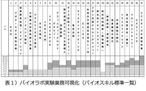 初めに実験業務の難易度を可視化するために、実験業務を要素分解し点数化しました。実験業務の作業については、バイオ基礎知識、さらに高度なバイオ、データ分析、機器原理等の知識が必要となります。高度な知識が必要な要素項目に関しては少し色の濃い部分で色分けしました。また、マイクロピペット操作や試薬の調製(試薬を量り、溶液に溶かす作業)はほぼ全ての実験業務おいて必須のため、網掛けで色分けしました。