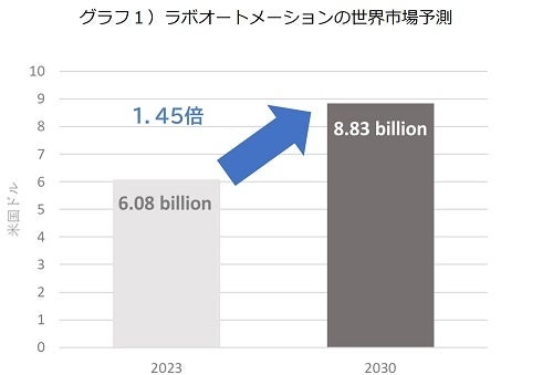 ラボオートメーションとは、科学の研究や実験を行う研究室・実験室(ラボラトリー)での作業を自動化するための技術や方法の総称であり、2030年の市場規模予測は、2023年のおよそ1.45倍*2になると予想されています。