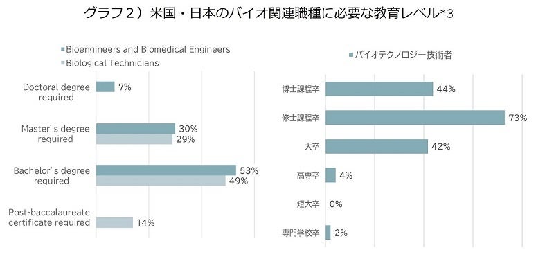 米国O*NETおよび日本版O-NETのデータベースより、バイオテクニシャン、バイオエンジニアとバイオテクノロジー技術者にとって必要な教育レベルは大学~大学院(修士・博士課程)卒業レベルを求めていることがわかり、ここからバイオ研究領域に就業する人材は高度人材であることがわかります。