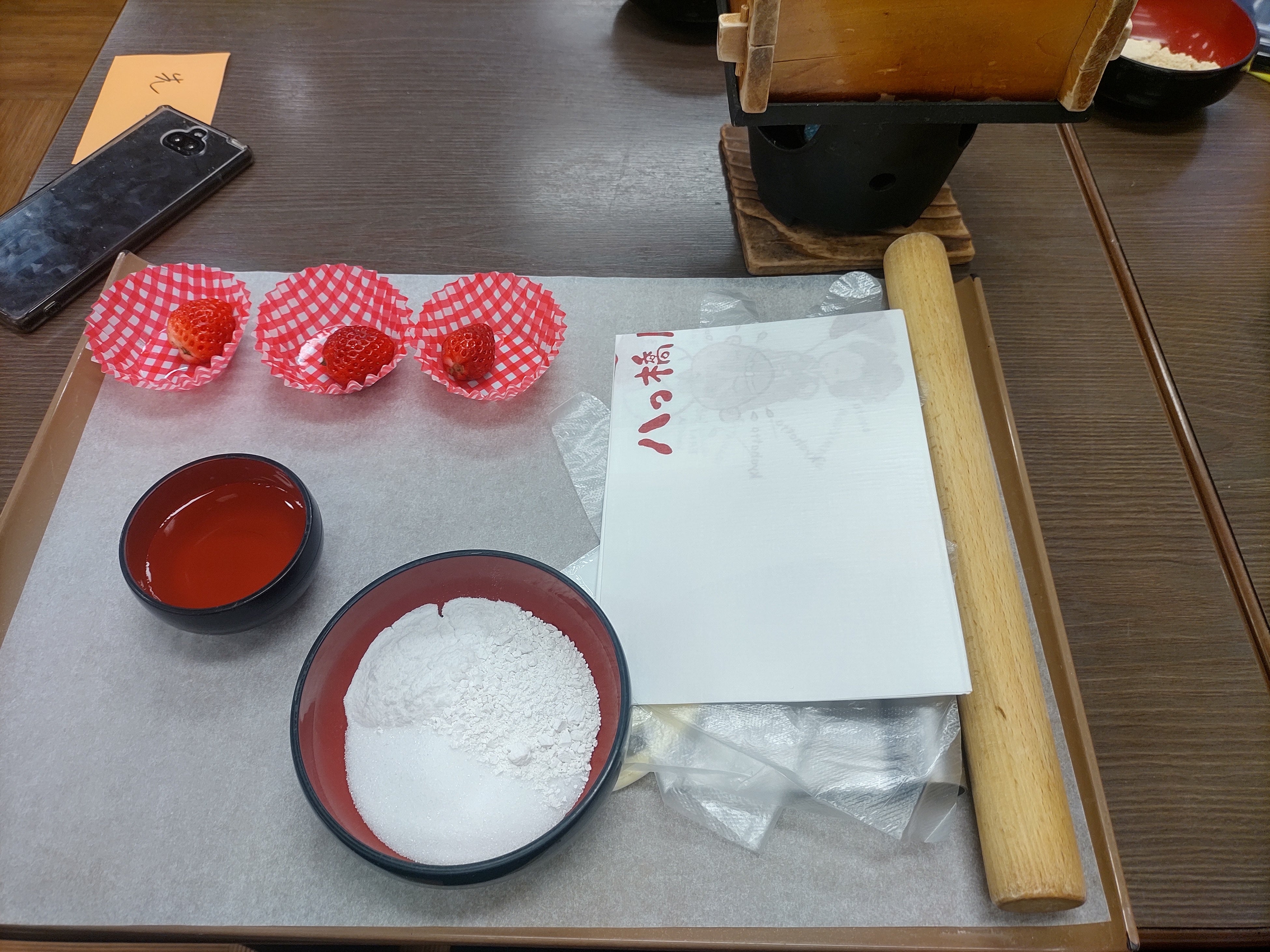 新鮮ないちごを京都を代表する和菓子の1つ「生八つ橋」でお花のように包んだ、かわいい創作生八つ橋「いちごちゃん」を作りを体験。こしあん・いちごミルク・抹茶の3種類の瑞々しい創作生八つ橋が完成しました。