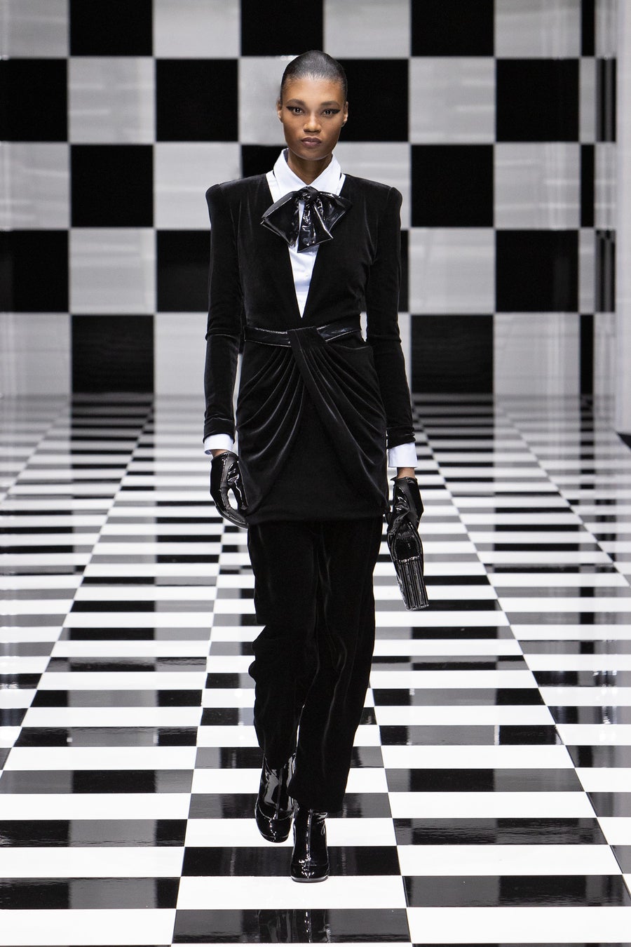 年末のパーティシーズンにピッタリな、ドレッシーなルックも登場しています。ベルベット素材の光沢が美しいミニドレスをロングジャケットのようにコーディネートしたり、白シャツと大きめのボウタイを合わせるなどマスキュリンとフェミニンの美しいバランスが魅力です。