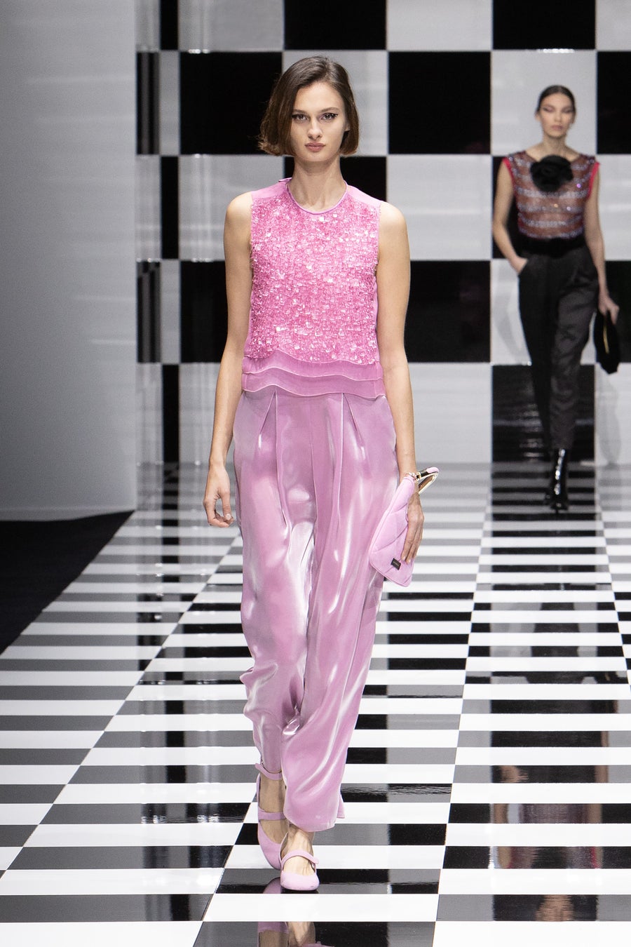 シーズンテーマに掲げた「色彩のリズム」を強く感じさせるルックも到着しています。スパンコールの立体的な輝きと、パンツに用いられたオーガンジーが生み出す光反射とのコンビネーションが特徴的なパステルピンクのルックは、ダークトーンの着こなしが増える秋冬シーズンにひと際アイキャッチ―な明るさをもたらします。個性の強い素材を組み合わせることで、フェミニンなカラーに力強さを与え、着る人の個性をより際立たせます。