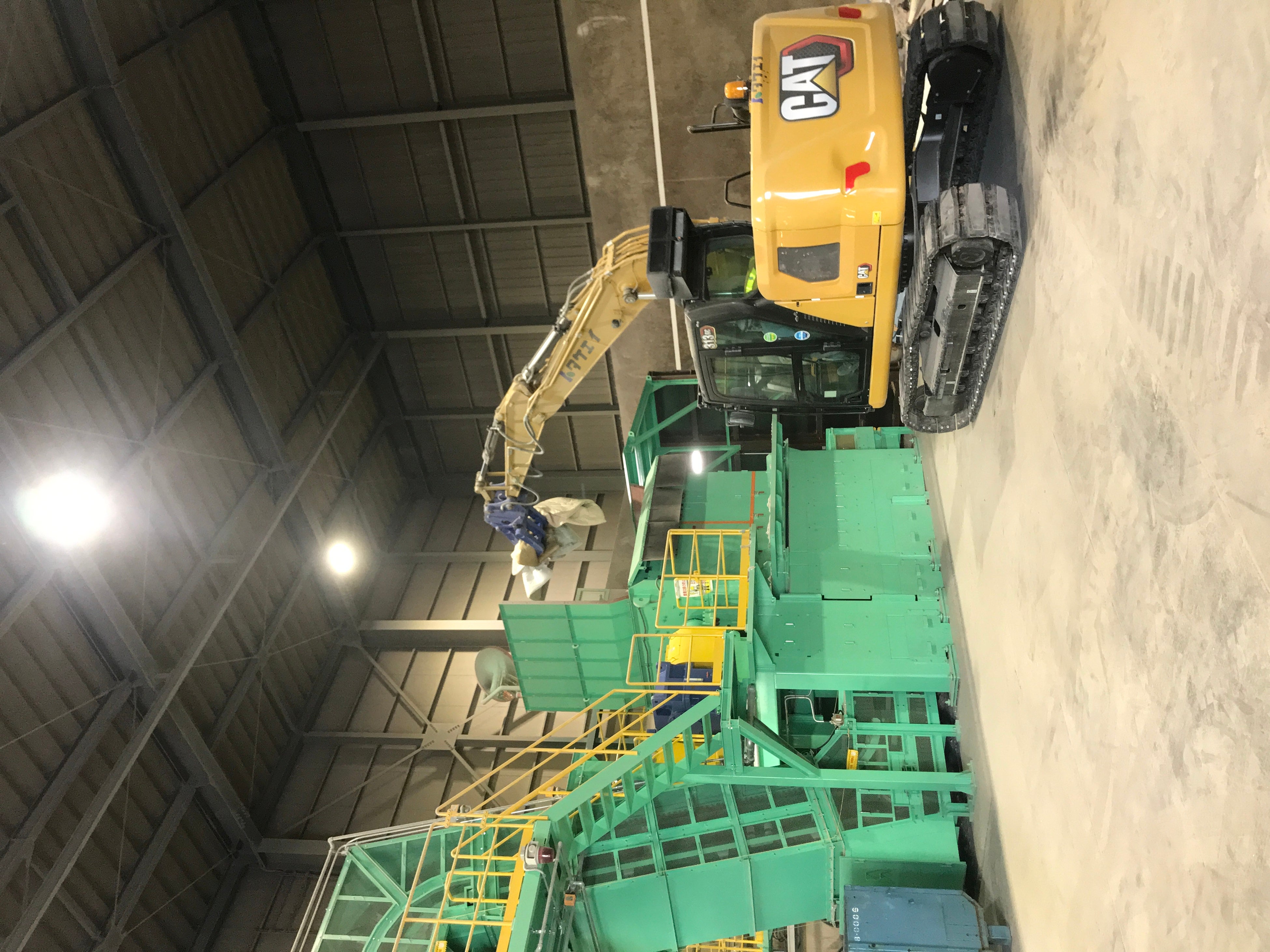 ▲回収したカーペット・敷布団を破砕機に投入する様子 ▲破砕されたカーペット・敷ふとんの様子