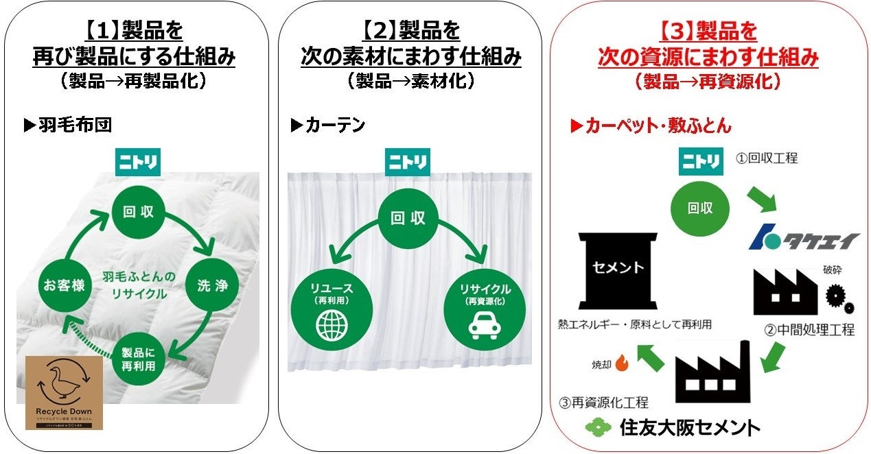 具体的には、①お客様がご不要になったカーペット・敷ふとんを、店頭もしくは配送時に無料回収する(ニトリ)、②中間処理にて破砕する(タケエイ)、③破砕物を熱エネルギーとして活用した上で、そこで発生した灰を捨てずに、更にセメント原料として活用する(住友大阪セメント)という3つの工程で、3社が協業しました。