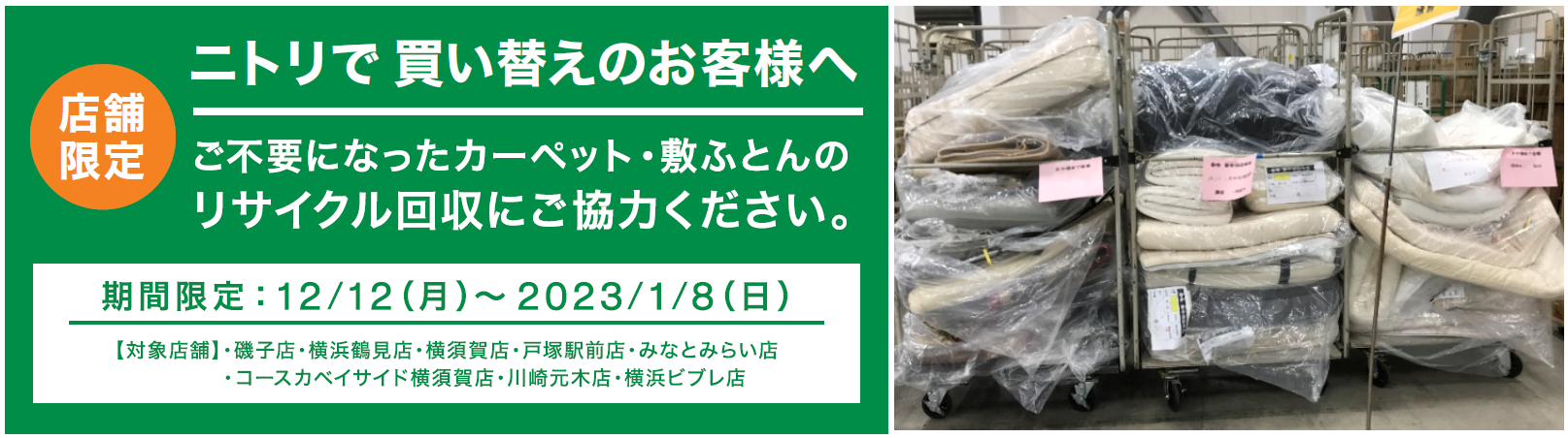 ▶詳細リリース:ニトリ初!カーペット・敷ふとんを回収し、セメント材料にリサイクルする実証実験を開始。