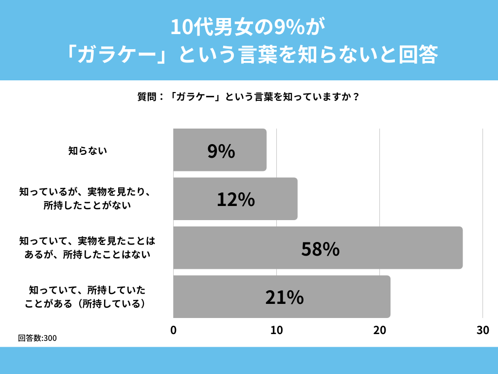 次いで多かったのが「知っていて、所持していたことがある(所持している)」と回答した方の21%。「知っているが、実物を見たり、所持したことがない」という回答が12%、「知らない」が9%で、「ガラケー」という言葉を知らないと回答した方は約1割に及びました。