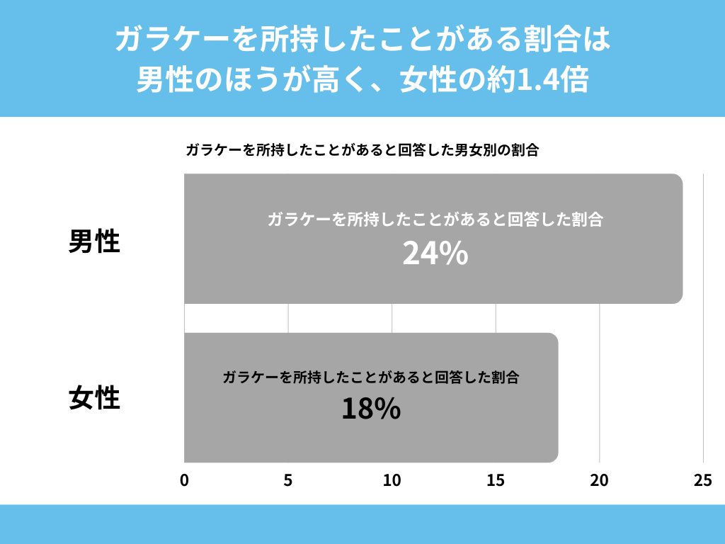 ガラケーを所持したことがあると回答した割合を男女別でみてみますと、男性が24%、女性が18%という結果になりました。