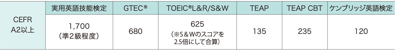 外国語、国際文化への興味・関心を持ち、将来グローバル社会での活躍を目指す者かつ下記英語力を有する者