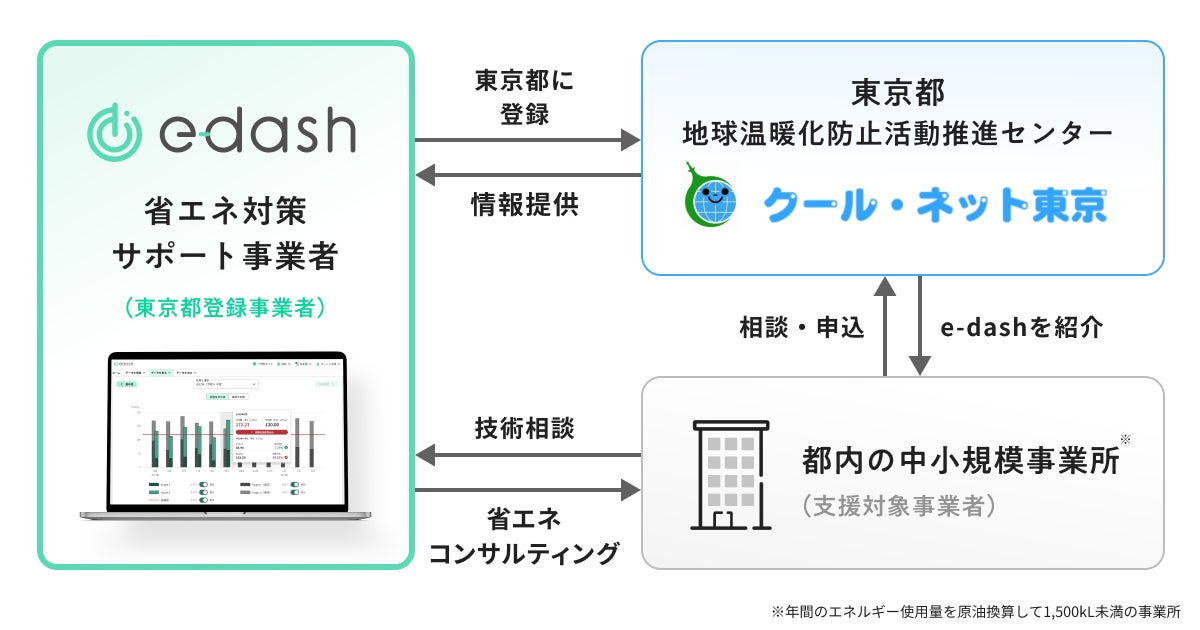 CO2排出量可視化・削減サービスプラットフォーム「e-dash」を提供するe-dash株式会社(本社:東京都港区、代表取締役社長:山崎冬馬、読み:イーダッシュ、以下「当社」)は、2025年度に東京都(知事:小池百合子)が推進する「東京都中小規模事業所省エネコンサルティング事業」において、「省エネ対策サポート事業者」として登録されたことをお知らせします。