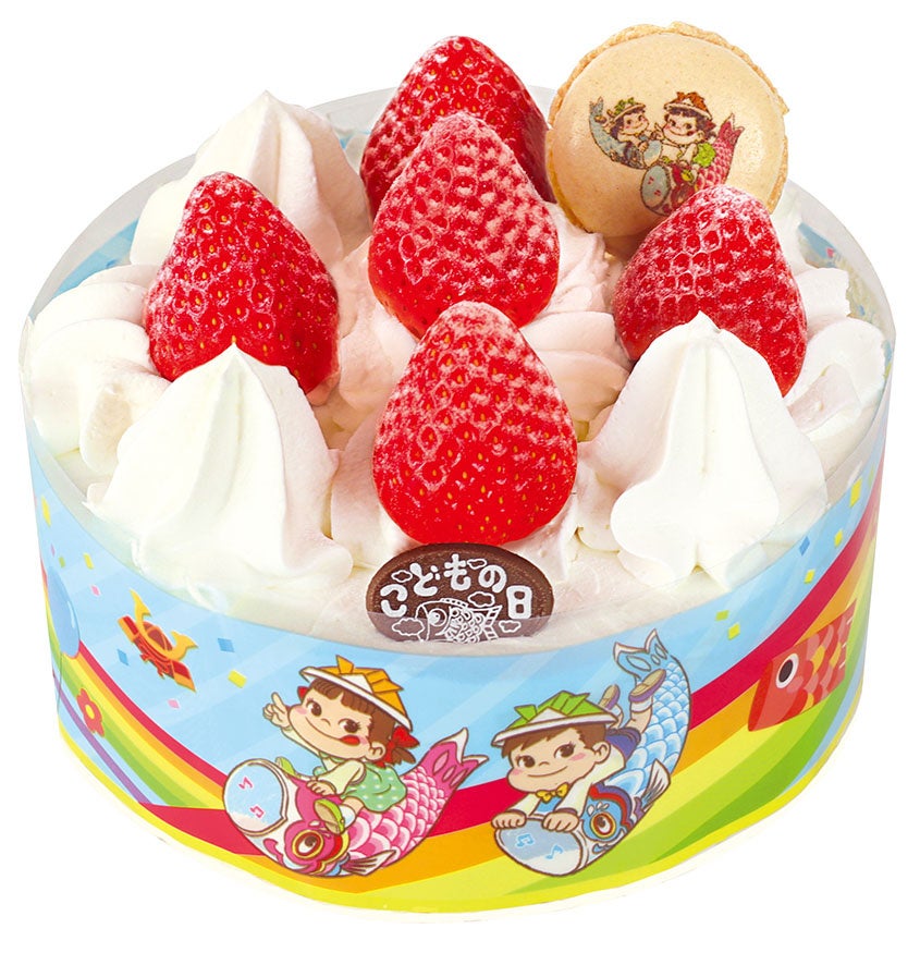シャンテリークリームとスライス苺をスポンジでサンドし、ペコちゃん・ポコちゃんがこいのぼりに乗っている楽しいイラストがデザインされた巻き帯で飾った苺のショートケーキです。こどもの日のお祝いにぴったりで、サイズは2種類からお選びいただけます。