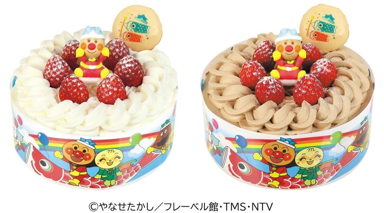 シロップ漬けの黄桃・リンゴをスポンジでサンドし、練乳入りのシャンテリークリームで仕上げたやさしい味わいのショートケーキです。クリームは乳酸菌・イソマルトオリゴ糖入り。上面には苺6粒と、かぶとをかぶったアンパンマンのグラスドールを飾ったかわいらしいケーキです。アンパンマンと仲間たちの描かれたポップなデザインの巻き帯が、こどもの日のお祝いを賑やかに演出します。ミルクチョコシャンテリークリームのチョコショートケーキも同時発売です。