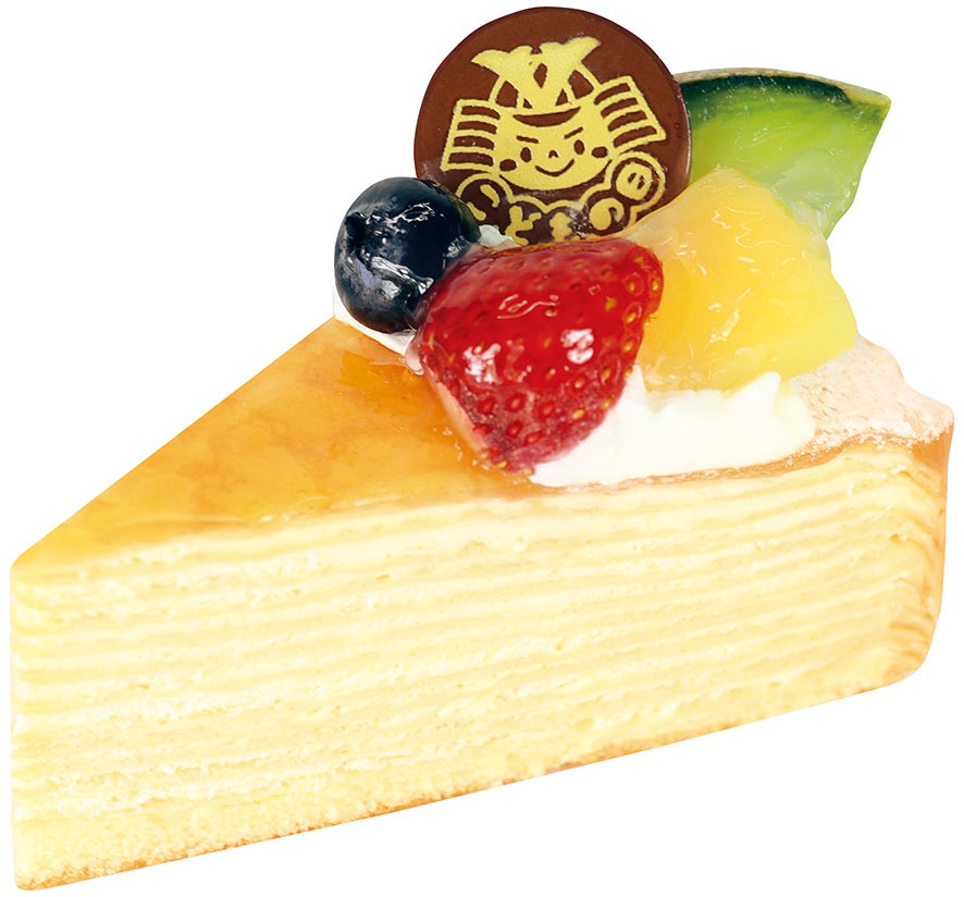 クレープ生地と練乳入り軽いタイプのカスタードクリームを交互に重ね、上部には苺、メロン、ブルーベリー、パイナップルのシロップ漬けを飾りました。こどもの日である5月5日(月・祝)限定で「こどもの日」のチョコアタッチメントが付きます。