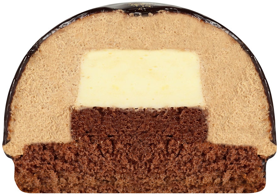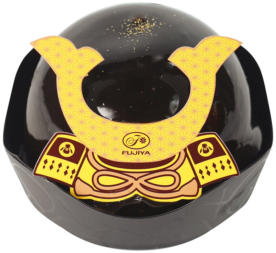 チョコスポンジにプリン、チョコムースを重ね、チョコグラサージュでコーティングしたかぶと型のケーキです。上面は金粉で華やかに仕上げました。