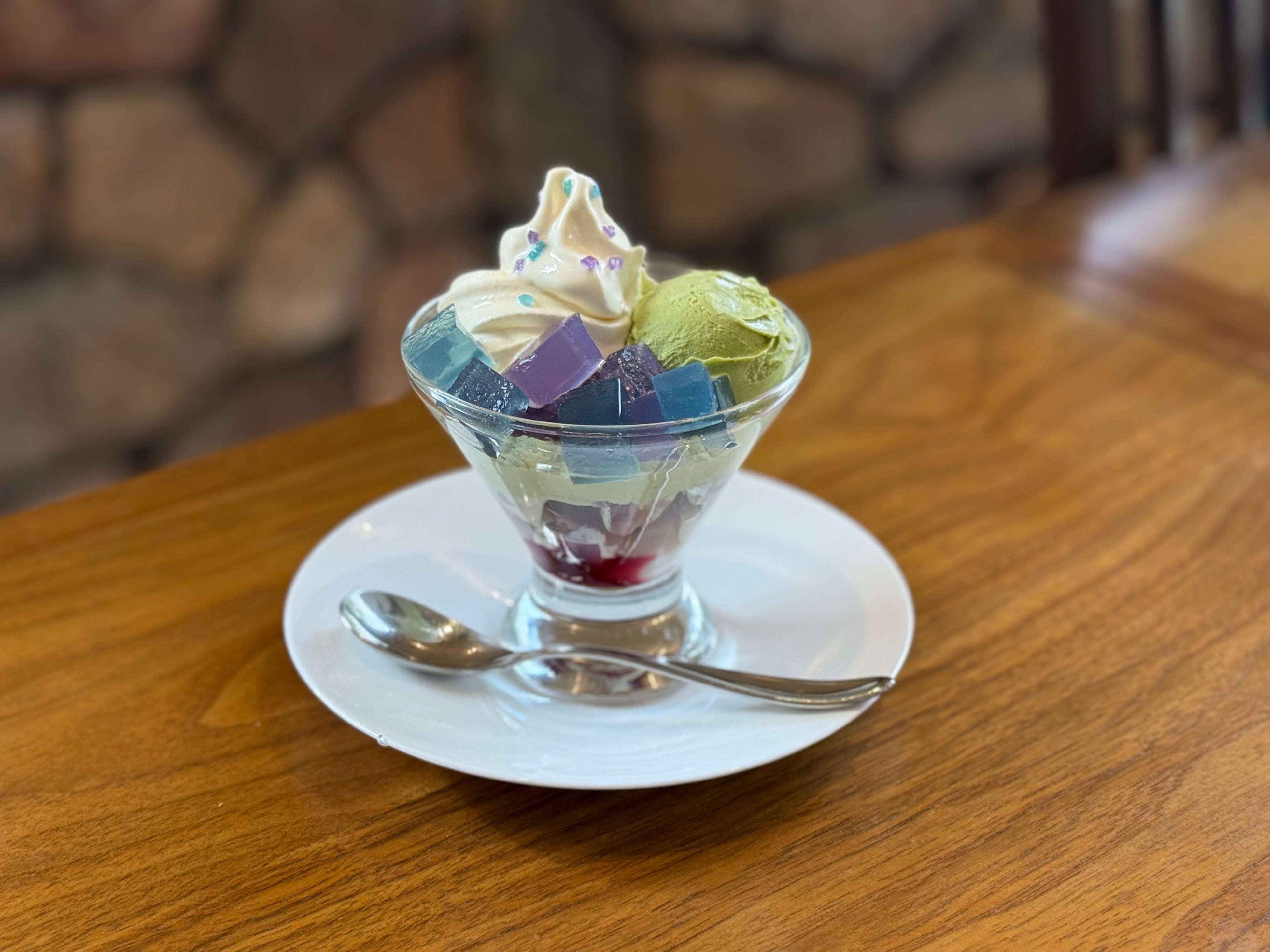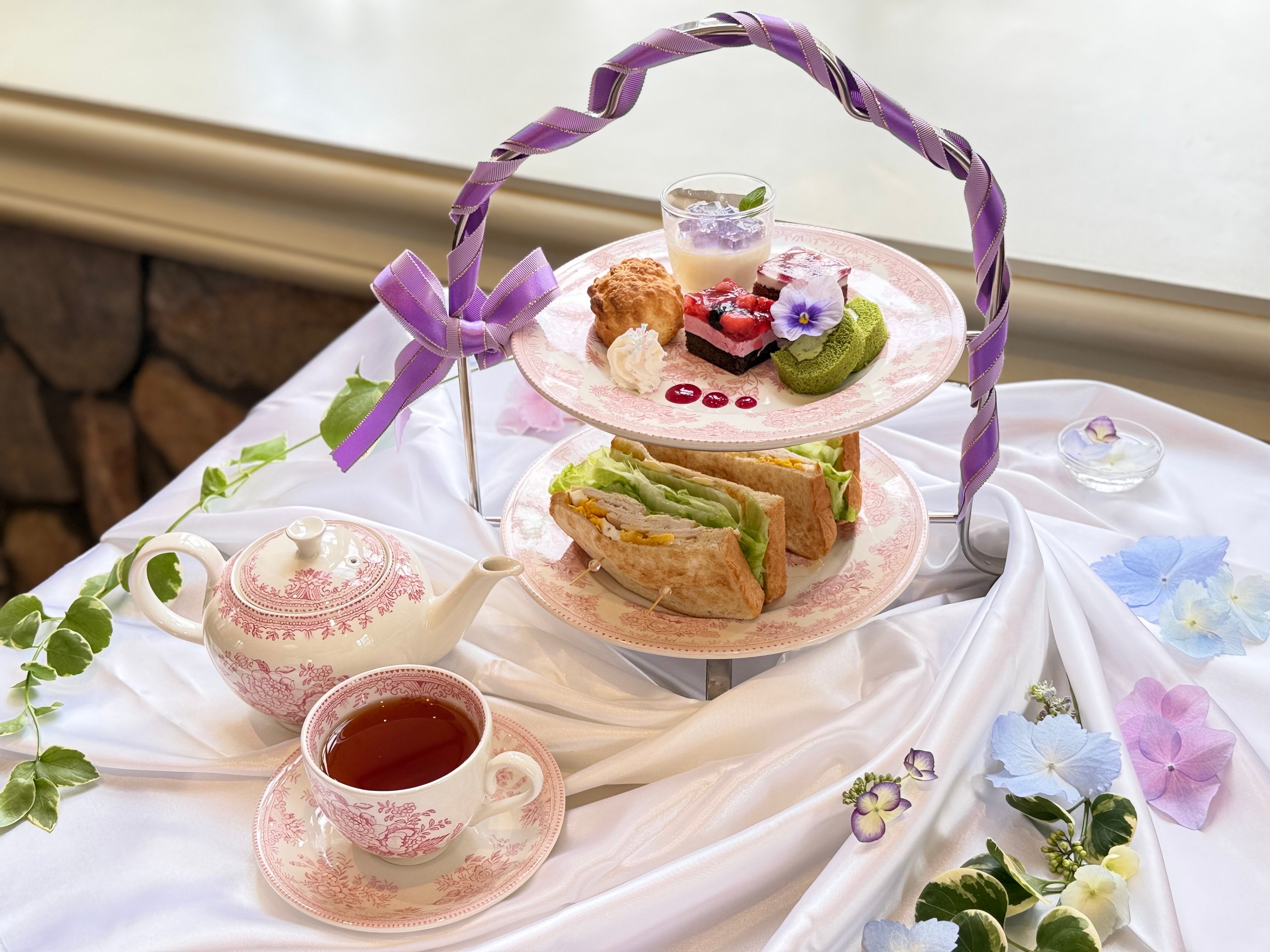バタフライピーティーを使った手作りあじさいゼリーがポイントの「あじさいアフタヌーンティー」をはじめ、寒天や抹茶アイス、バニラソフトを重ねた「あじさいあんみつパフェ」など初夏を感じる爽やかなメニューをご用意しました。