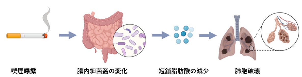 慢性閉塞性肺疾患 (COPD)は、世界の死因の第3位を占める重要な呼吸器疾患です。この病気は主に喫煙により起こる肺の慢性炎症が原因であり、肺気腫という特徴的な病理学的所見を呈します。近年腸内細菌叢を介した腸管と肺疾患の関連、特に腸内細菌によって産生される短鎖脂肪酸の関連が報告されています。しかし腸内細菌叢および腸内細菌によって産生される短鎖脂肪酸が実際にCOPDの病態に関与しているのかは明らかにされていませんでした。