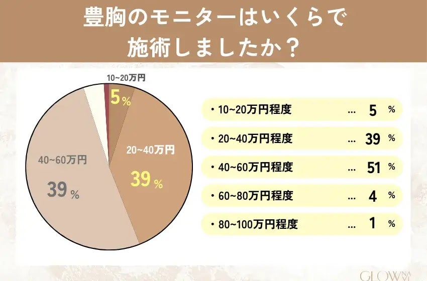「40〜60万円」が最多(51%)で、「20〜40万円」(39%)が続く結果に。通常価格では100万円を超える施術もあるため、モニター制度による割引額は大きく、費用面での満足度が高いことがうかがえます。