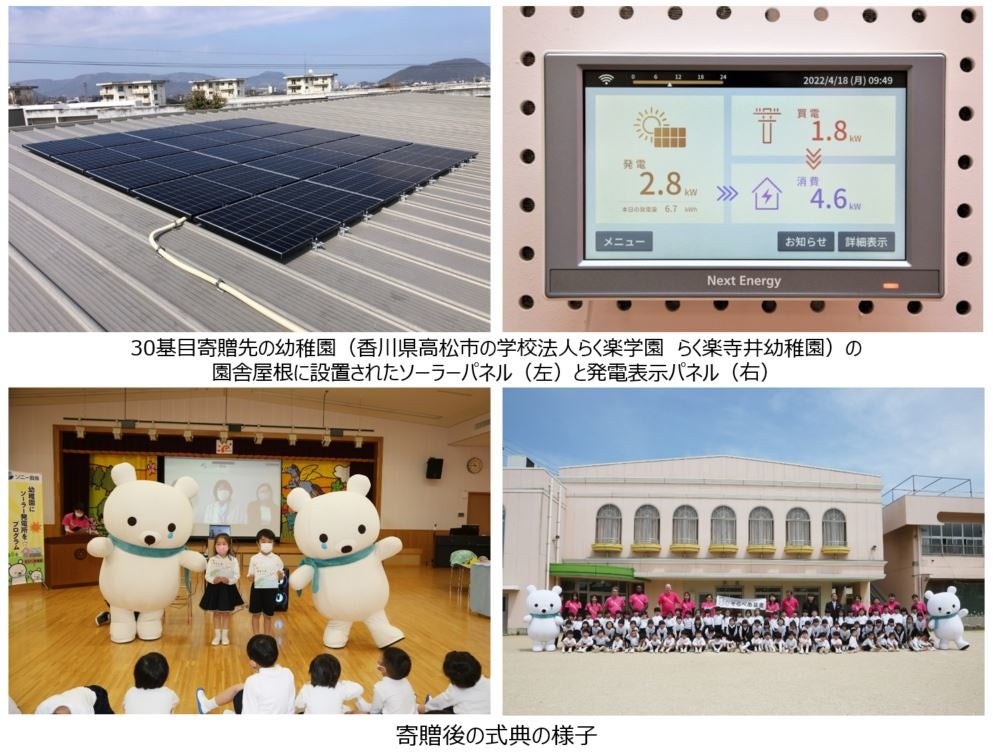 (*1)「そらべあ発電所」寄贈先は、そらべあ基金が選定します。なお、同基金では、賛同企業からの寄付をもとに「そらべあ発電所」を全国の幼稚園や保育園に寄贈する取組みを「そらべあスマイルプロジェクト」と称しており、リンク先ページのタイトルは「そらべあスマイルプロジェクト」となっています。