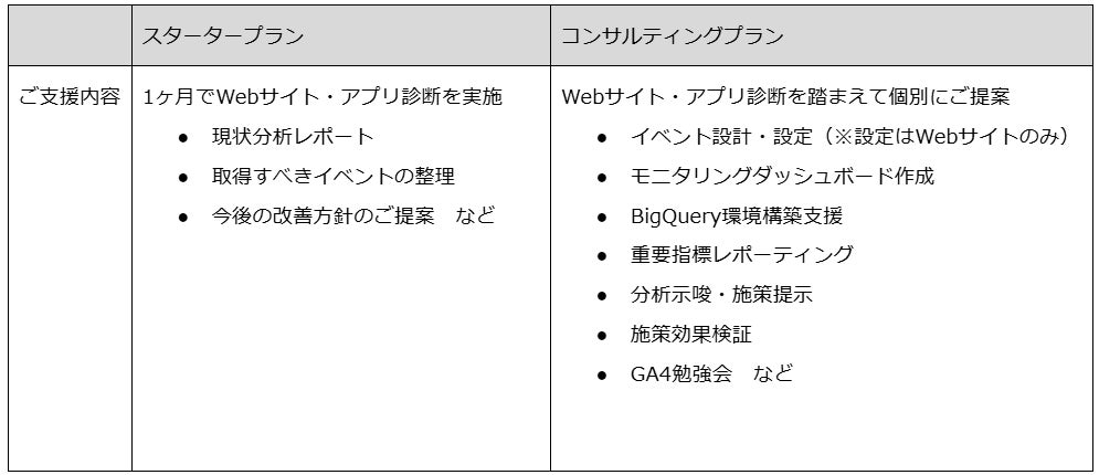 サービス内容の詳細はこちらをご覧ください。(ご支援の内容は、企業のGA4の活用状況に合わせて柔軟に設計することも可能です。)