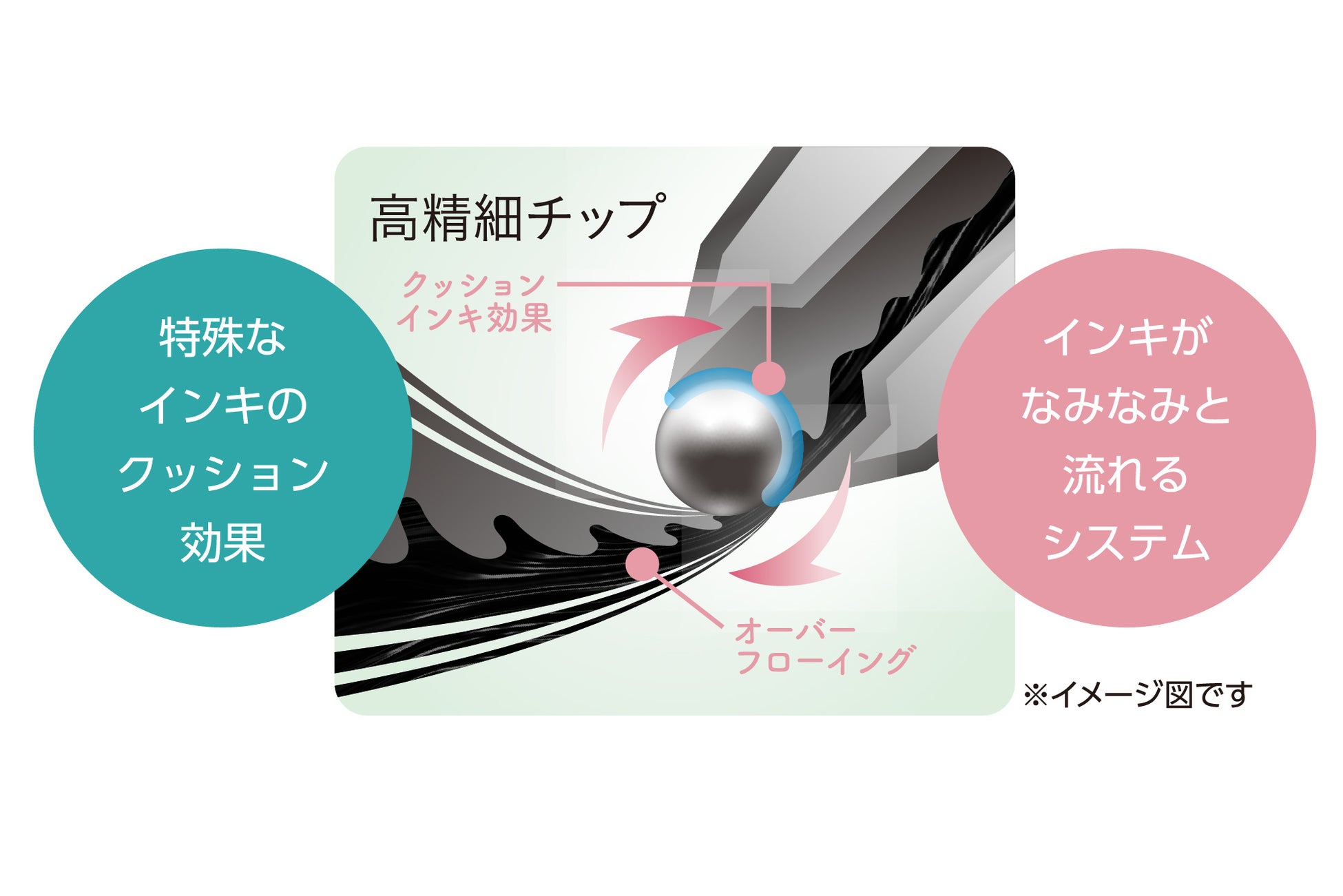 インキがなみなみと流れるシステム×特殊なインキのクッション効果の仕組みによって、ボールペン筆記時に生じる摩擦を極限まで軽減し、浮遊感のある書きごこちを実現しています。