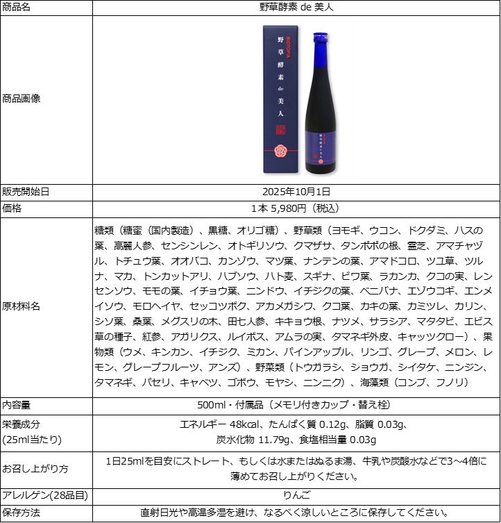 株式会社ブルックス(本社:神奈川県横浜市、代表取締役社長:小川裕子)は、BIOTOPIA(ビオトピア)より、発酵のチカラで美容と健康をサポートする酵素ドリンク『野草酵素de美人』を2025年10月1日に新発売いたします。