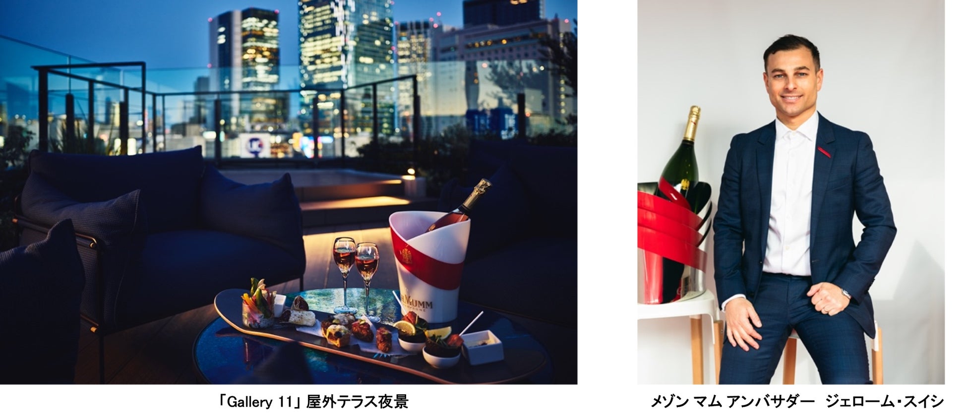 セットメニューで提供される料理は、地中海料理をベースに日本のツイストを効かせた「Gallery 11」らしいスペシャルプレート。クリエイティビティ溢れる料理とロゼシャンパーニュの見事な融合をお愉しみください。また、4月12日(金)、5月24日(金)には、DJが「マム グラン コルドン ロゼ」に合わせたプレイリストを、特別にテラスでパフォーマンスする限定イベントが開催されます。イベントには、『メゾン マム』シャンパン・アンバサダーのジェローム・スイシも来場し、シャンパーニュのサーヴと共に『メゾン マム』のストーリーをご案内いたします。