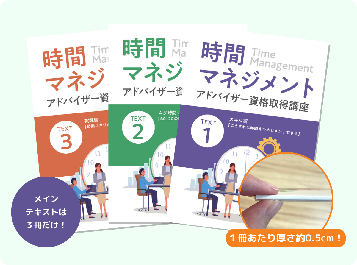 メインのテキストは全3冊。時間マネジメントアドバイザーに必要な知識をすべて網羅しています。