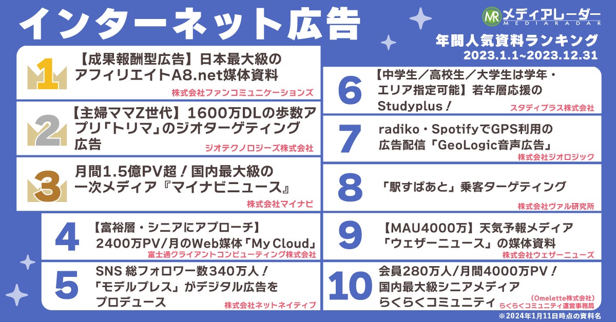 【2023年年間】人気資料ランキングを発表!国内No.1*の広告・マーケティングプラットフォーム「メディアレーダー」