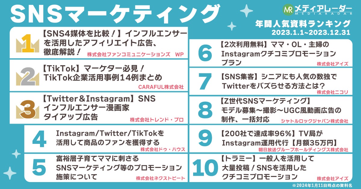 日々新たな手法が生まれる広告施策の中で、今回SNSに関連した資料が1位・2位となっており、SNSを活用した施策の注目度の高さがうかがえます。