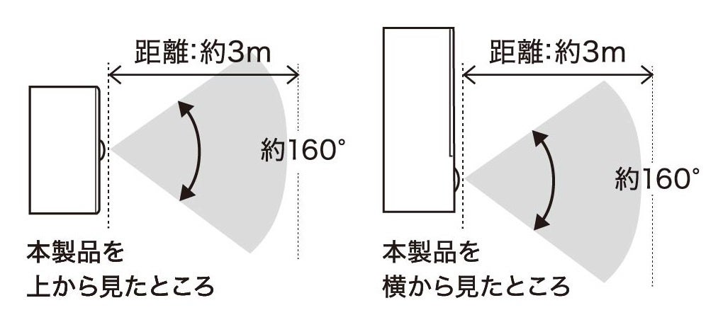 ※人以外でも熱源となるもの(車、動物、木の枝、洗濯物の揺れ、空調機、室外機の風、暖房機の温風など)にも反応します。特に強い熱源は範囲外でも検知する場合があります。