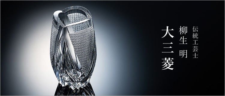 2025年2月に新たな伝統工芸士に認定された、柳生明氏による「大三菱」。菱と菱を合わせて、全体として大きな三つの菱になるようにデザインし、底の切れ込みが上昇していくダイナミックなカットが印象深い。三角形に刻んだ菊繋ぎのカットもモダンな雰囲気をまとっている。