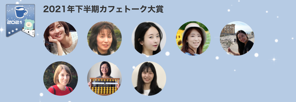 「カフェトーク・アワードに投票してくださった生徒の皆さま、そしてこの1年間に、私のレッスンを受講してくださった皆さま、本当にありがとうございました。皆さんとお知り合いになれたこと、皆さんが目標に向かって進んでいくのを見守れたこと、そしてレッスンのたびに皆さんが自信をつけていくのをそばで見ることができたことを嬉しく思います。皆さんが素晴らしい新年を迎えられることを願うとともに、2022年もまたお会いできることを楽しみにしています!」*カフェトーク事務局による翻訳