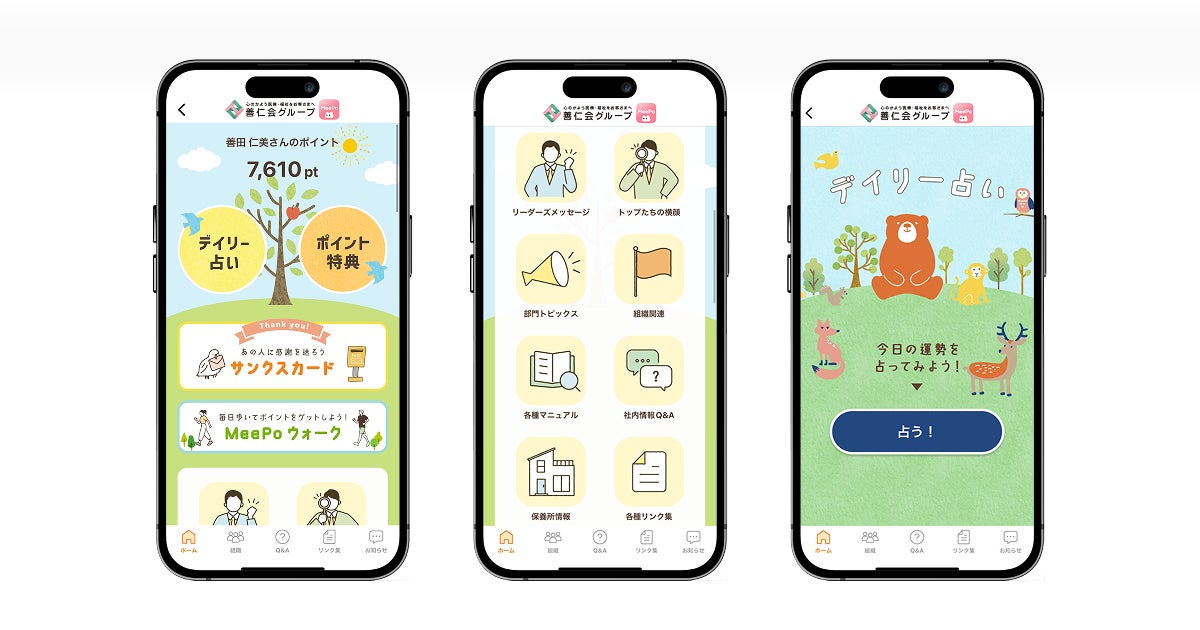 「MeePo」アプリは、従業員が自然と情報に触れたくなるようなワクワクする体験を提供することを重視し、アプリ限定の楽しいコンテンツや仕掛けを多数搭載しています。これにより、善仁会が掲げる理念やビジョンを全従業員に浸透させ、さらなる一体感向上を目指しています。
