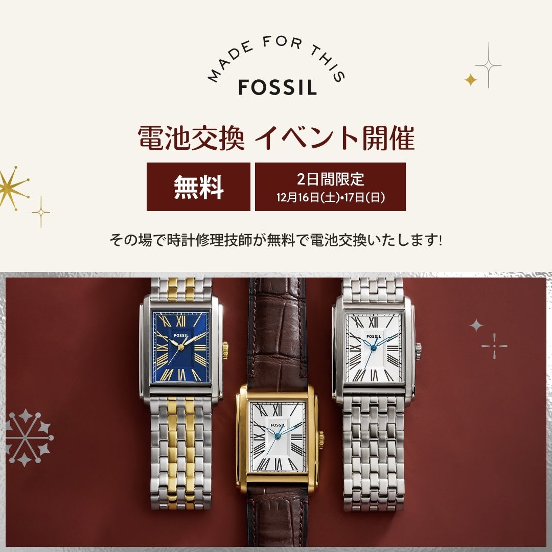 アメリカ・テキサス州に本拠地を持つFossil Group, Inc. の日本現地法人である株式会社フォッシルジャパン(所在地:東京都豊島区、代表取締役社長:中井 直)は、フォッシルブランド対象店舗において、2023年12月16日(土)・12月17日(日)の2日間限定で、「無料電池交換イベント」を開催いたします。