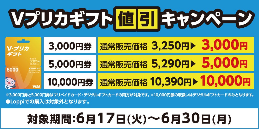 キャンペーン期間中、ローソン店内のギフトカードコーナーにあるVプリカギフトを、通常価格よりお安くご購入いただけます。