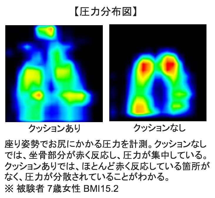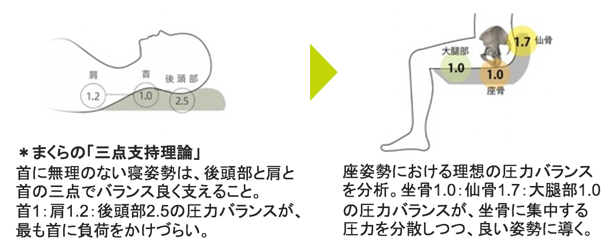 まくらの開発で培った圧力バランスの独自理論「三点支持理論*」を応用。寝具に使用する体圧測定器を使ってお尻の座圧バランスとポイントを把握し、坐骨、仙骨、大腿部における理想の圧力バランスを分析。坐骨、仙骨、大腿部の三点でバランス良く支えることでで、坐骨部分にかかる圧力を分散。