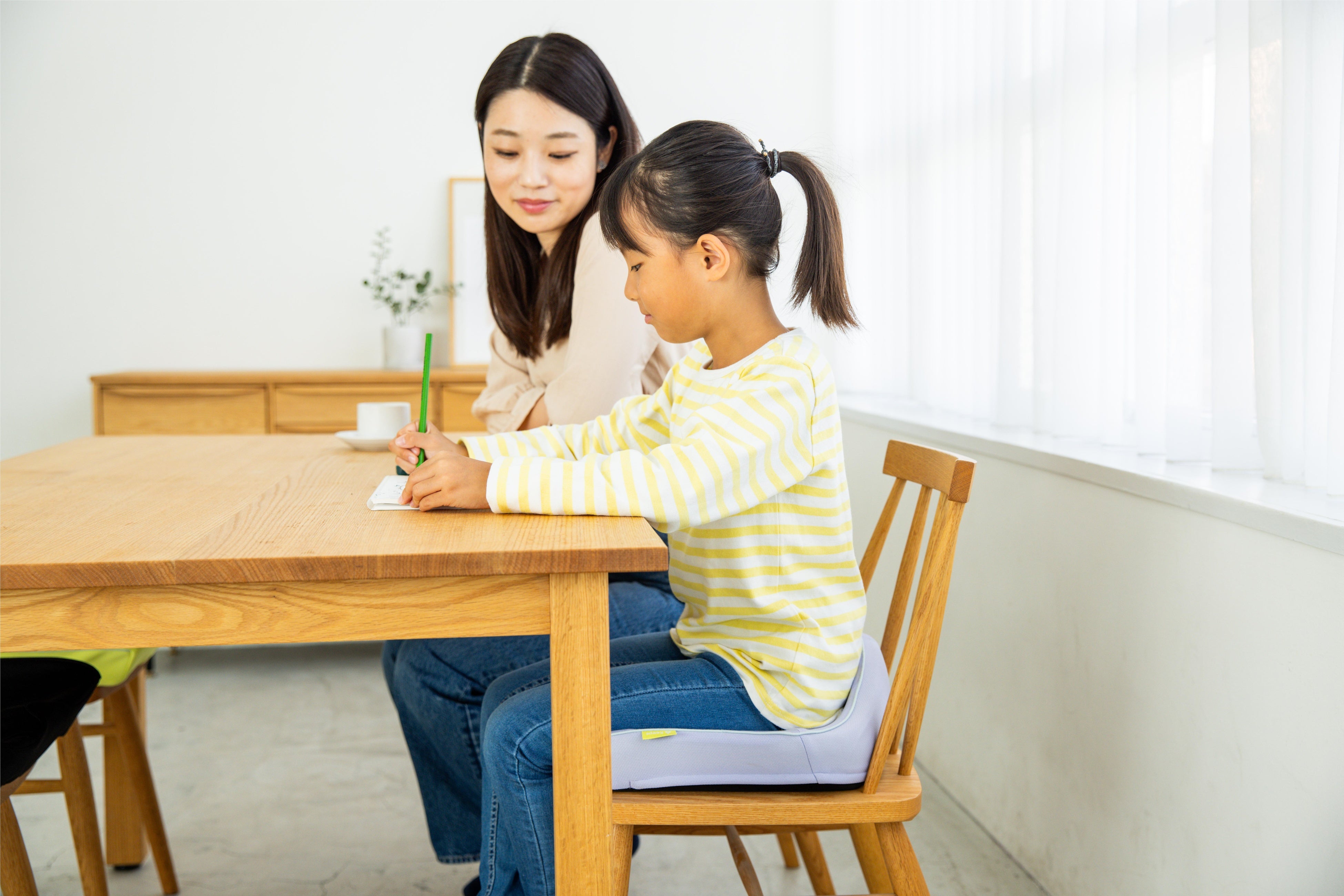 悪い姿勢で長時間座っていると、体の部位にムダな負担をかけるため、正しい姿勢で座ることが健康には、とても大切です。勉強中や食事中など、長く座っていられず悪い姿勢が気になるシーンに、『Keeps クッション for kids』は骨盤を立たせて理想的な姿勢をラクにキープします。