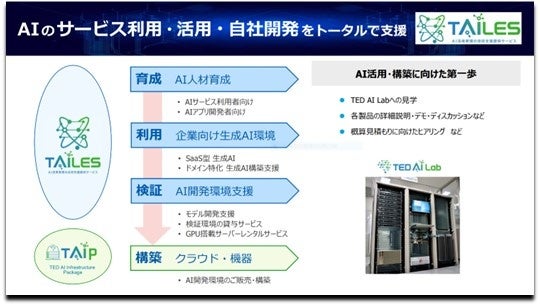 TEDは「TAILES」の提供により、組織のAIリテラシーの底上げや人材育成、ChatGPTサービスなどの利用によるDX推進、大規模言語モデルの開発など幅広い課題解決に取り組み、AI導入によるお客様のビジョン達成に向けて継続的に貢献してまいります。