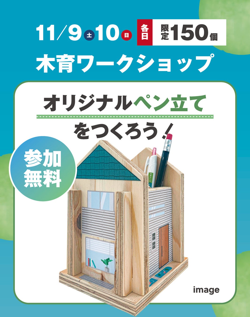 プレカット工場では、加工時に出た端材や木屑をリサイクルし、日本の森林環境の保全に貢献しています。アイダ設計ブースでは、その端材からできたパーツを組み立て、シールで自由にデコレーションできる木育ワークショップ「端材でつくる!オリジナル木製ペン立て」を開催します。