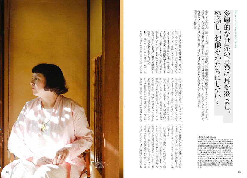 アーティスト・インタビューは、様々な土地で人と関わりながら、人間の想像力や物語創造を探求するエレナ・トゥタッチコワ。国立西洋美術館での展覧会へ参加した作家に、世界の道づくりとしてとらえている「歩行」や、多様なメディアによる表現方法、そしてその根底に流れる思考について、崔敬華が話を聞いた。