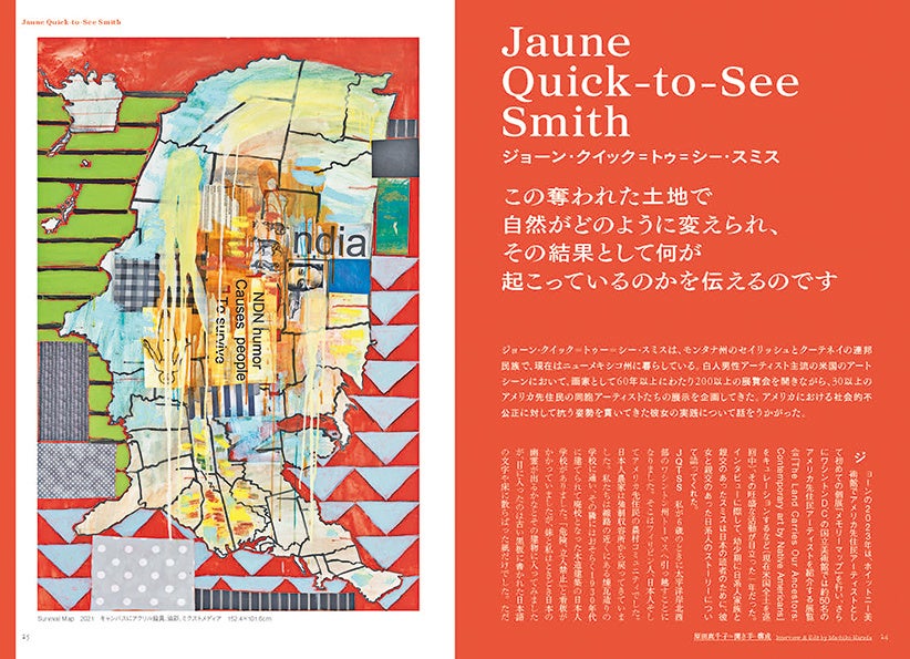 本特集で監修を務めた原田真千子の巻頭言から、「今回のヴェネチア・ビエンナーレならびに近年の国際的なアートシーンにおける先住民のアーティストの存在感を、私を含む非先住民の人々は、一過性のトレンドだと思ってはならない。先住民たちが何十年にもわたって闘い続けている直接的な運動に始まり、アートの表現と実践を通して行動の先陣を切ってきた、数多の先住民のアーティストとキュレーターたちの持続的な努力と築き上げたネットワークによって、点が線となり、線が重なり、先住民たちを疎外し、周縁化してきたマジョリティが無視できないステージへと、その扉を開いてきたのだ」。