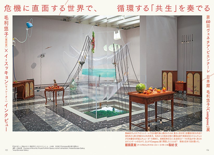 第2特集は、第60回ヴェネチア・ビエンナーレ日本館の毛利悠子「Compose」展をリポート。動きと音を伴う音響彫刻的な作品で国内外から高く評価される毛利悠子。そして毛利からの指名により、イ・スッキョンが日本館初の外国人キュレーターを務めた。この2人が「Compose」展で意図したこととは? 飯田真美が迫る。