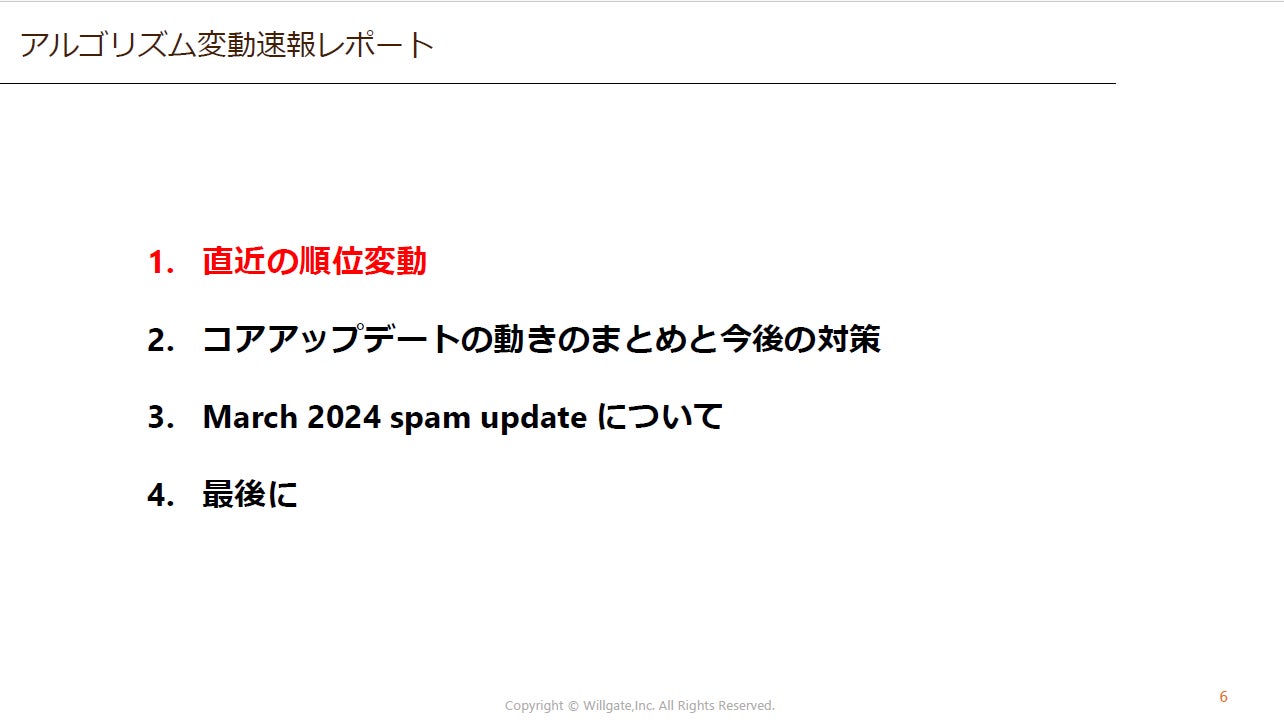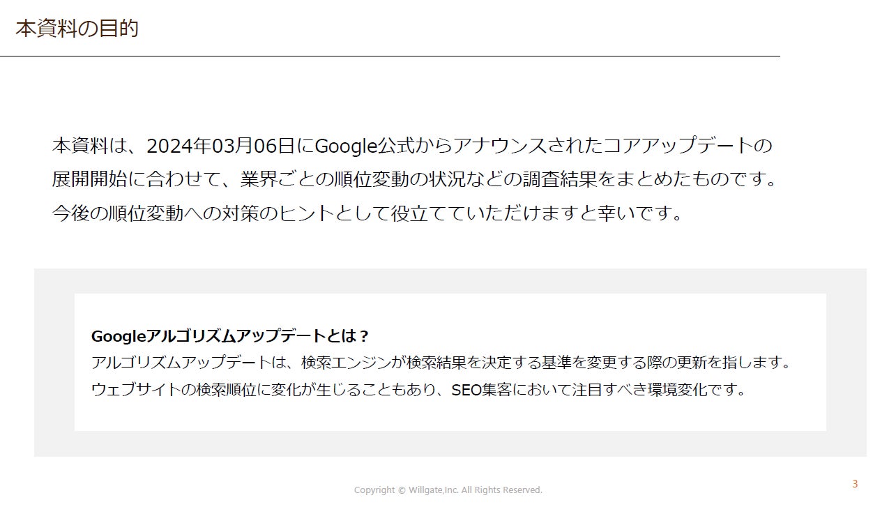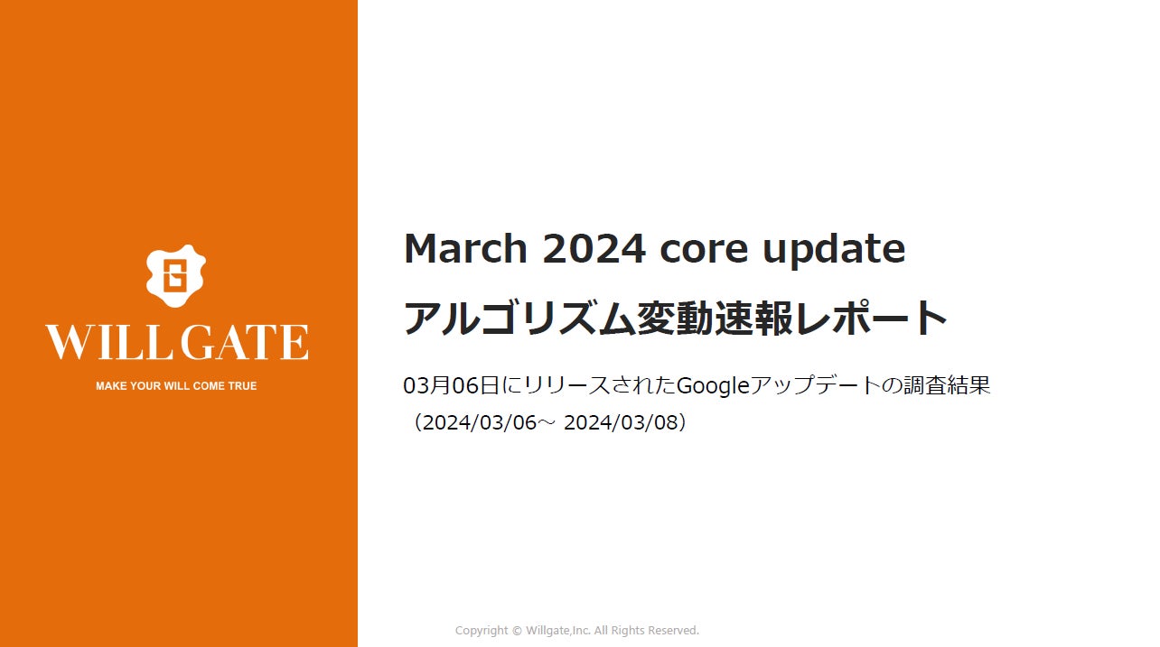 株式会社ウィルゲート(本社:東京都港区、代表取締役:小島 梨揮、以下「ウィルゲート」)は、2024年3月6日(水)にGoogleからリリースされたアルゴリズムアップデート(March 2024 core update)の情報をレポートにまとめ、無料公開しました。このレポートは自社サイトのSEO状況に影響を感じている方に向けた調査レポートになります。
