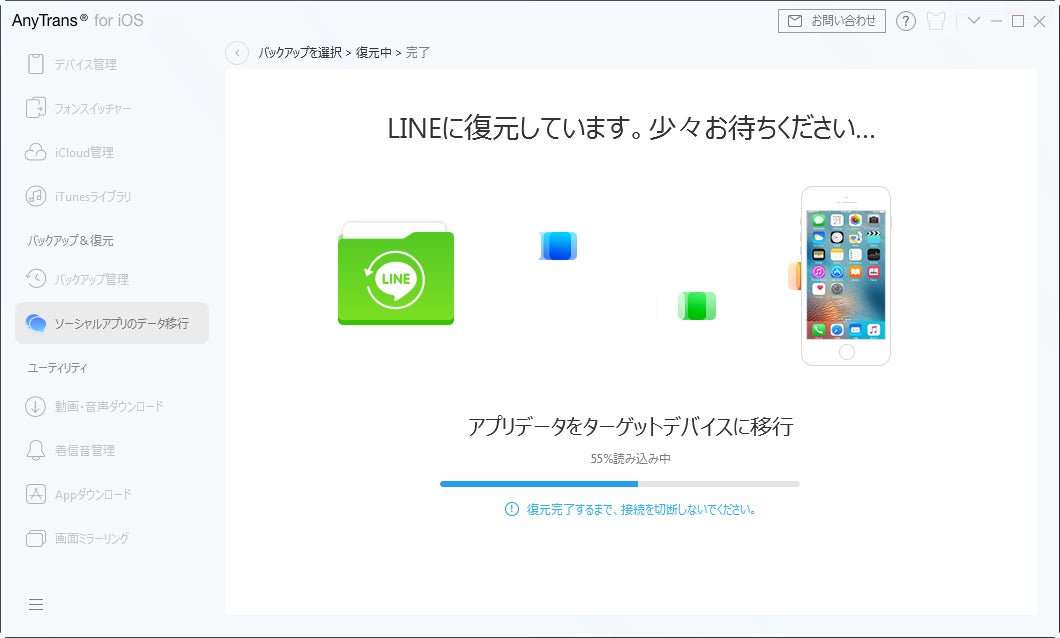 7.LINEトーク履歴をデバイスに復元するプロセスが始まります。しばらくお待ちください。復元完了までデバイスの接続を切断しないでください。
