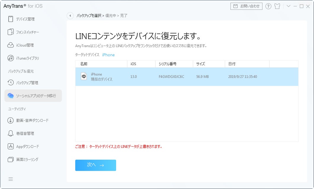 6.AnyTransは自動的にパソコン上のバックアップデータを表示してから、復元したいバックアップを選択したら、「次へ」をクリックします。