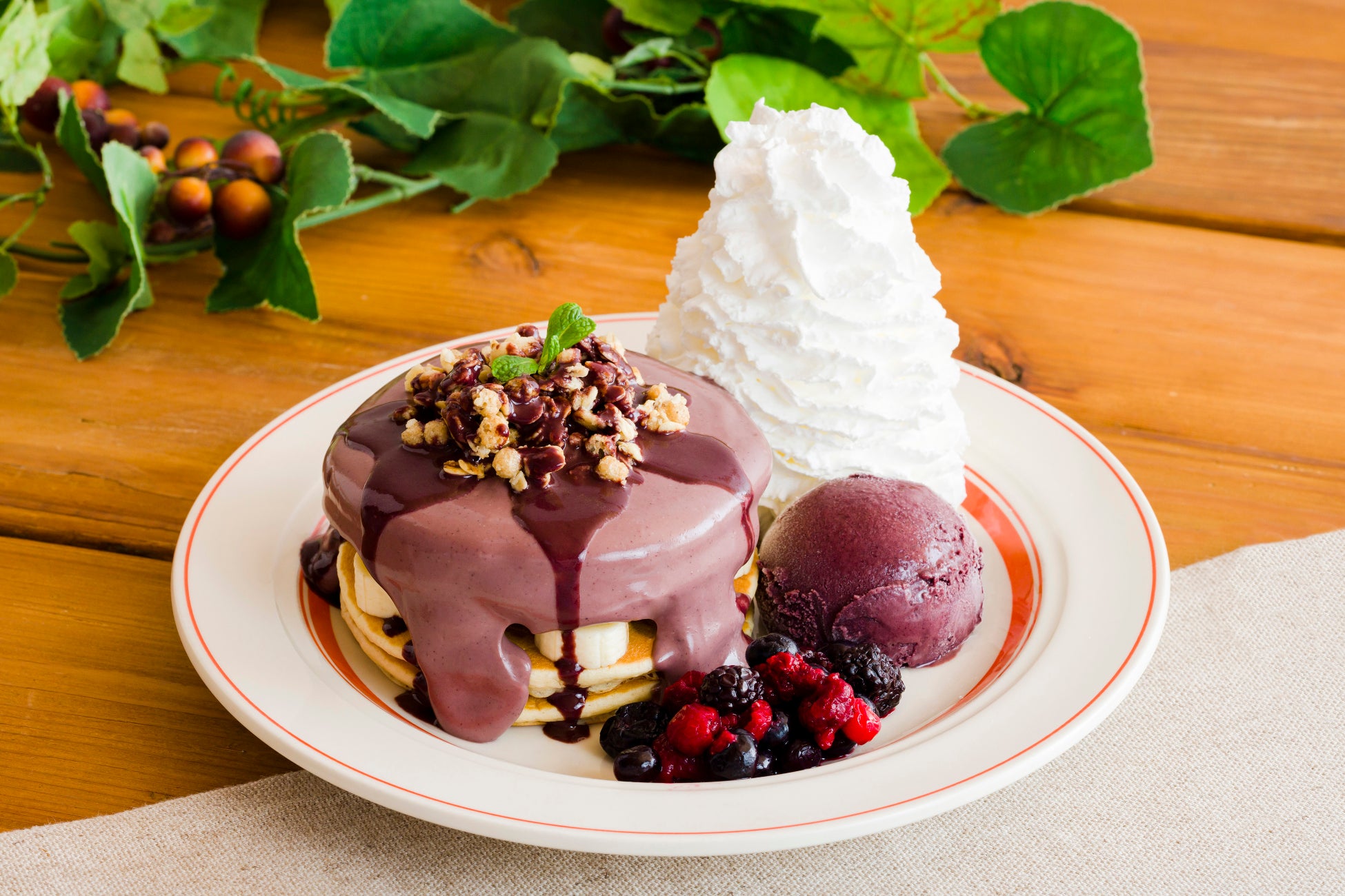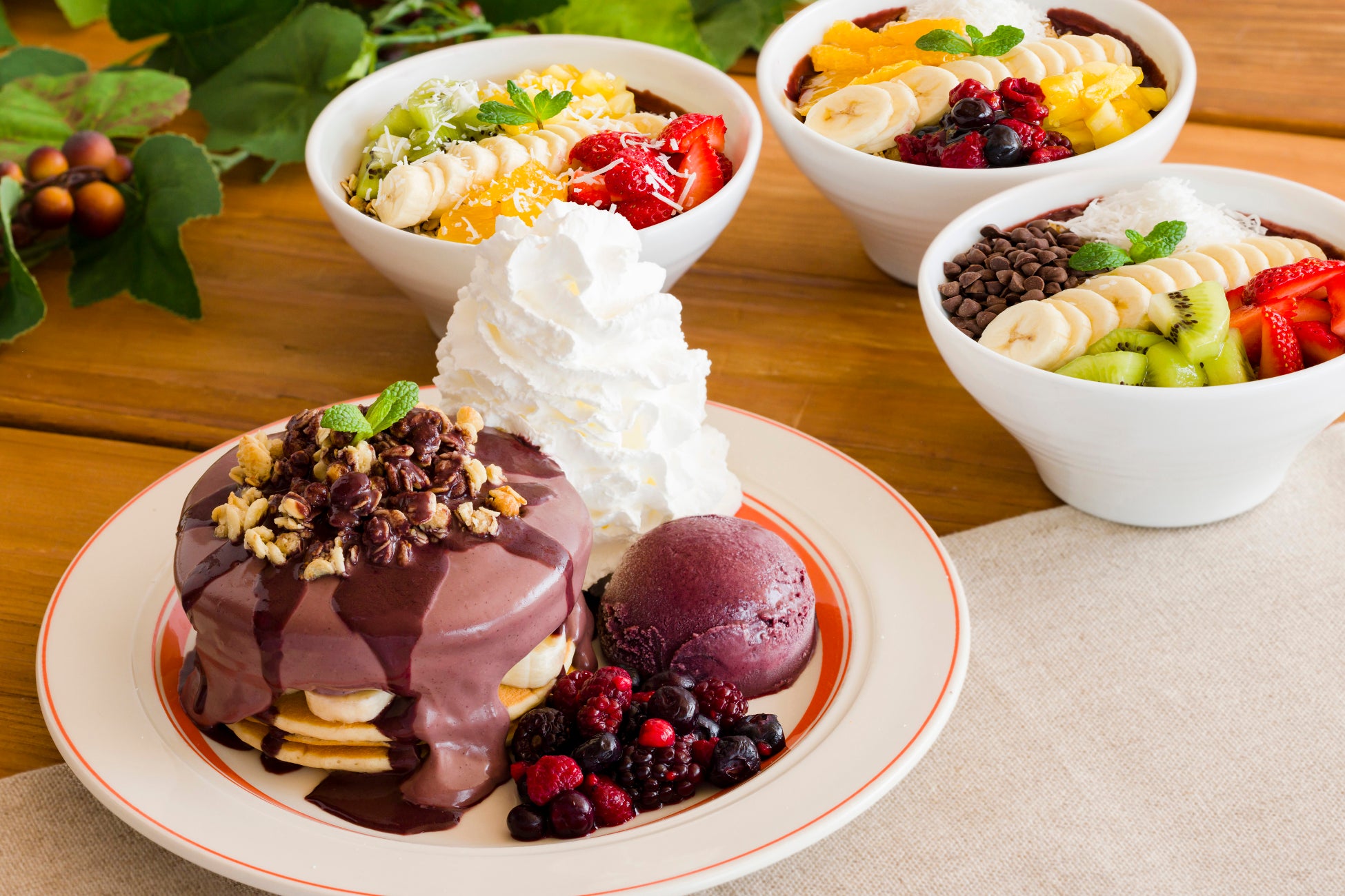 Eggs ’n Thingsではアサイーボウルはもちろん、クリームとソースをたっぷり使ったパンケーキでお楽しみいただけます。相性の良いバナナ・ミックスベリーとご一緒にどうぞ!