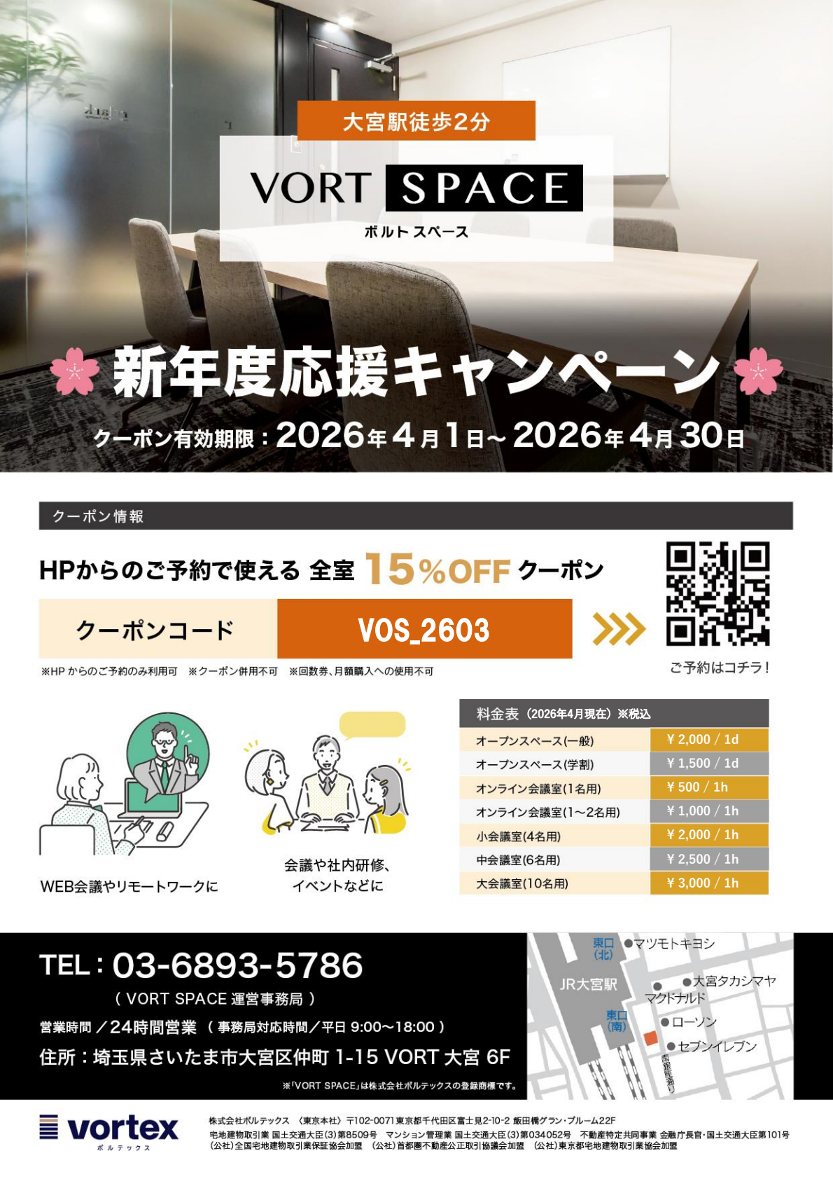 「区分所有オフィス®」を主軸に資産形成コンサルティングを行う株式会社ボルテックス(東京都千代田区 代表取締役社長 兼 CEO 宮沢 文彦、以下当社)は、当社が運営するサテライトシェアオフィス「relark(リラーク)大宮」について、運営体制の変更に伴い、2026年4月1日(水)より施設名称を「VORT SPACE(ボルトスペース) 大宮」へ変更するとともに、終日非対面運営へ移行いたします。